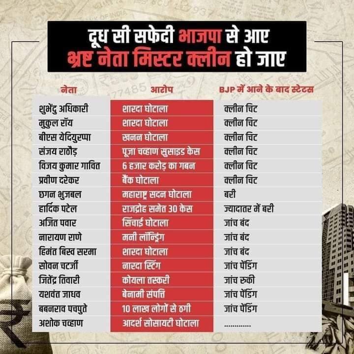 महाराष्ट्रातील बिल्डर लॉबीचे लाडके अजित पवारांवर 70,000 कोटींच्या भ्रष्टाचाराचा आरोप मोदींनी केल्याच्या काही दिवसातच अजित पवार फक्त भाजपच्या सत्तेत सामील झाले नाहीत तर त्यांना भाजपने उपमुख्यमंत्री आणि अर्थमंत्री सुद्धा केले आणि भ्रष्टाचाराच्या उगमस्त्रोताचे खाते सुपूर्त केले. देशातील विमान वाहतूक व इतर बड्या उद्योगपतींचे लाडके राष्ट्रवादीचे प्रफुल पटेल सुद्धा याचप्रकारे दोषमुक्त झाले आणि आता सत्तेचा भाग झाले आहेत. आदर्श घोटाळ्यावरून भाजपने रान उठवले आणि आता त्याच घोटाळ्याचे अग्रणी नेते अशोक चव्हाण हे भाजपमध्ये सामील झाल्यावर त्यांना चक्क राज्यसभेवर पाठवले आहे! पश्चिम बंगालमधील तृणमूलचे सुवेंदू अधिकारी याच श्रेणीतील. त्यांच्यावर नारदा स्टिंग ऑपरेशन संदर्भातील आरोप होते. 2020 मध्ये ते भाजपत सामील झाले आणि सर्व चौकशा जणू काही स्वत:हून बिळात जाऊन लपल्या आहेत! आसमचे माजी कॉंग्रेसी नेते हेमंत बिस्व सर्मा यांच्यावर शारदा चिटफंड घोटाळ्याचे आरोप केल्यानंतर आता ते भाजपत सामील झालेत आणि त्यांना मुख्यमंत्री केले गेले आहे!