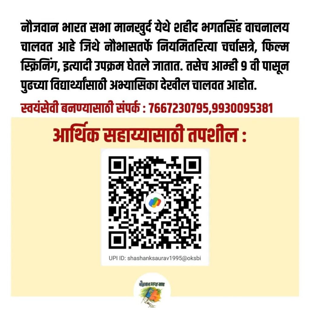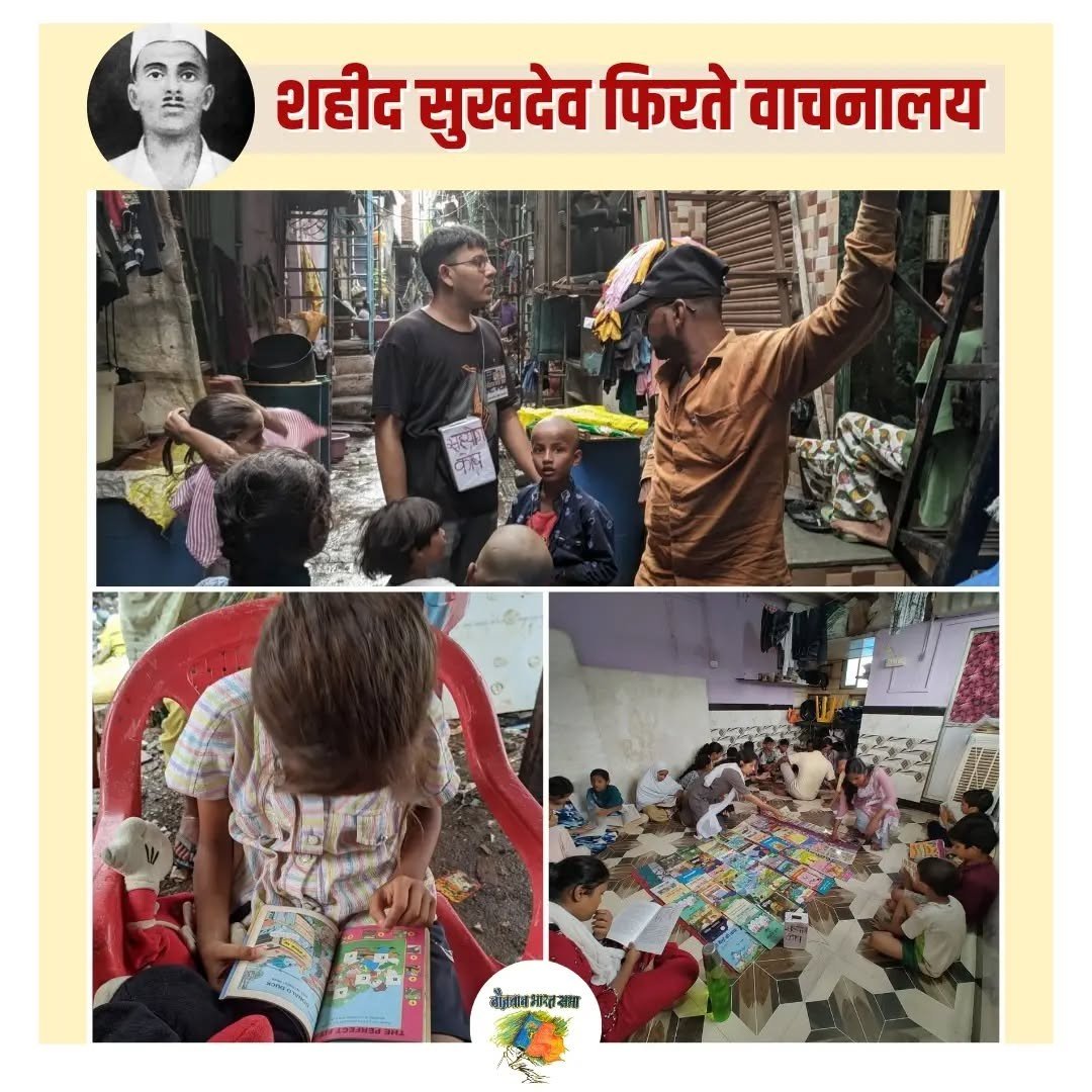 घराघरात प्रगतिशील साहित्य पोहचवण्यासाठी पुढे या! स्वयंसेवी बना! आर्थिक सहयोग करा! पुस्तके द्या!!नौजवान भारत सभेतर्फे चालवण्यात येणारे फिरते वाचनालय मागील काही वर्षांपासून निरंतरपणे मानखुर्द गोवंडी येथील वेगवेगळ्या भागांत सुरू आहे. त्याचाच आता विस्तार करत ते इतर भागांत देखील सुरू करण्यात आले आहे. रील्स (Reels) आणि सोशल मीडियाच्या काळात विद्यानासोबत जोडलेली बरीच माहिती, गोष्टी, कविता आणि अभ्यासापासून मुलांना नियोजित पद्धतीने दूर ढकलले जात आहे, ज्यामुळे लहानपणापासूनच मुलांची बौद्धिक आणि सांस्कृतिक स्तरावर घसरण होत आहे. अशात अत्यंत गरजेचे आहे की शक्य ते प्रयत्न करून मुलांना वैज्ञानिकदृष्ट्या परिपक्व आणि एक संवेदनशील माणूस बनवणे! त्यासाठीच अशी प्रगतिशील पुस्तके आणि फिरती वाचनालये मोठ्या प्रमाणावर सुरू करणे गरजेचे आहे. म्हणूनच मुंबईतील मुसळधार पावसात सुद्धा नौभास शहीद सुखदेव फिरते वाचनालय मानखुर्द गोवंडीच्या वस्त्यांमध्ये चालवत आहे.