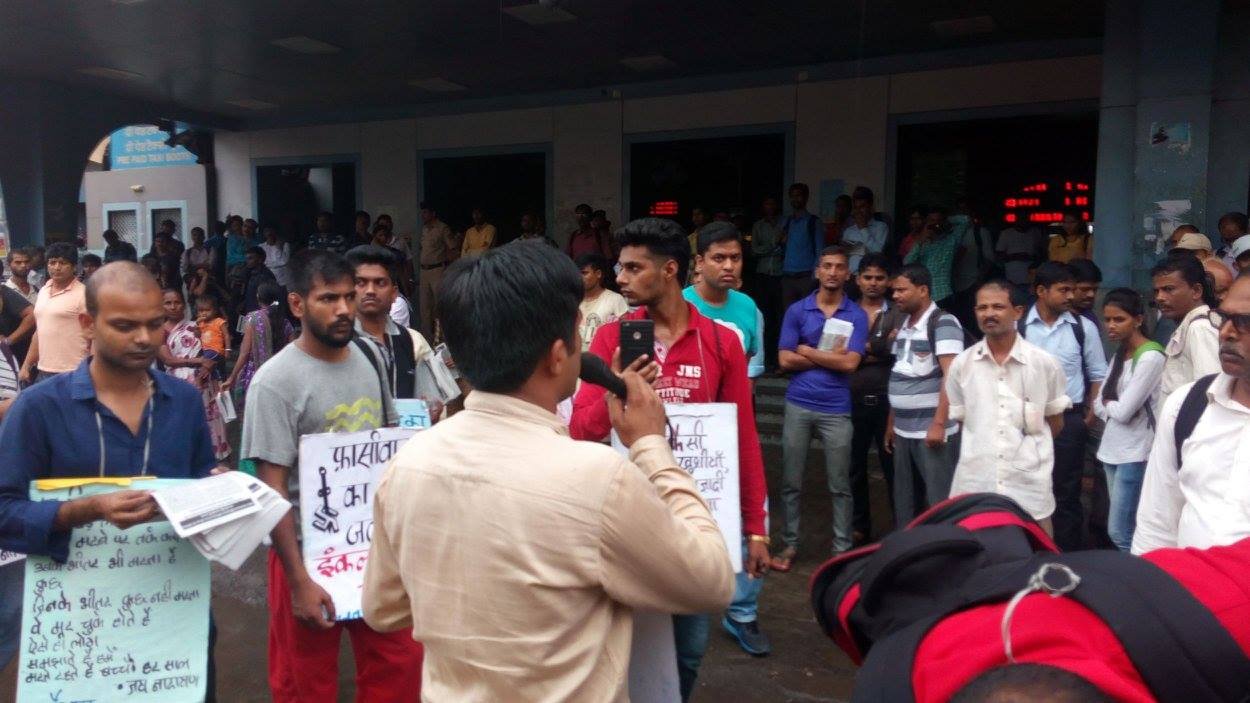गोरखपुर के बीआरडी मेडिकल कॉलेज में एक हफ्ते पहले हुए मासुमों के सरकारी हत्याकाण्ड के विरोध में आज नौजवान भारत सभा व बिगुल मजदूर दस्ता द्वारा मुम्बई के दादर स्टेशन पर प्रदर्शन किया गया। प्रदर्शन के दौरान सैंकड़ों की संख्या में मराठी व हिन्दी पर्चे बांटे गये। 70 बच्चों की मौत हुई, कौन है इसका जिम्मेदार, योगी सरकार योगी सरकार : शिक्षा, स्वास्थ्य सबका अधिकार, बन्द करो इसका व्यापार जैसे नारे लगाते हुए नौजवान भारत सभा के कार्यकर्ताओं ने लोगों के बीच इस घटना की असलियत रखी व स्वास्थ्य के बुनियादी अधिकार के लिए एकजुट होने का आह्वान किया।