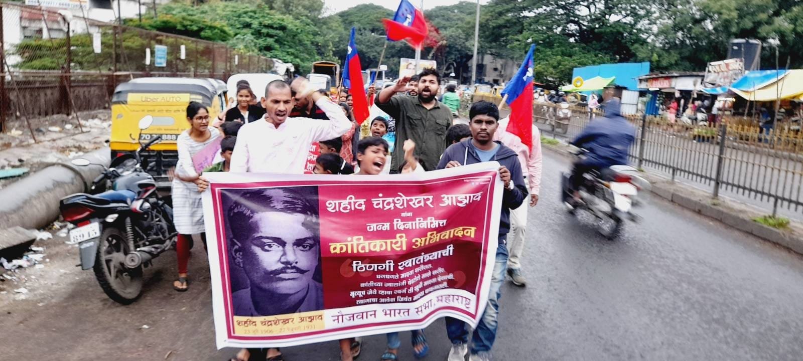 आज शहीद चंद्रशेखर आझाद यांच्या जन्मदिनानिमित्त (23 जुलै) नौजवान भारत सभेतर्फे पुण्यातील दांडेकर पूल भागात अभिवादन कार्यक्रम करून पदयात्रा काढण्यात आली