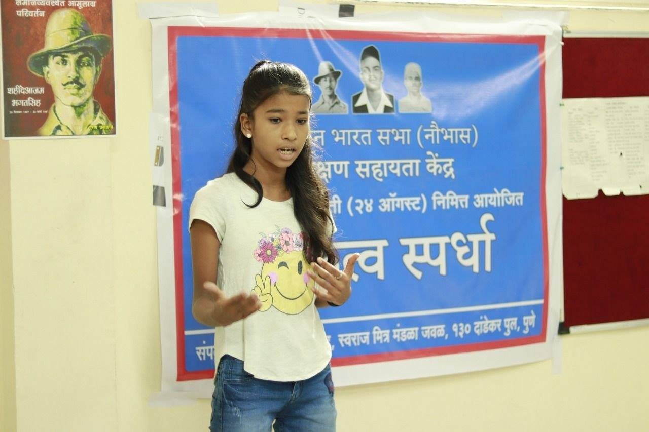 शहीद शिवराम राजगुरू यांच्या 111व्या जन्मदिना(24 ऑगस्ट) निमित्त वस्तीमध्ये 7 वी ते 10 वी च्या विद्यार्थ्यांसाठी 25 ऑगस्ट, रविवार रोजी वक्तृत्व स्पर्धेचे आयोजन करण्यात आले. अनेक मुलांनी उत्साह दाखवत ‘भगत सिंह व त्यांच्या साथीदारांची स्वातंत्र्य लढ्यातील योगदान’, ‘आपण स्वतंत्र आहोत काय?’, ‘शहीद राजगुरू यांचे जीवनकार्य’, ‘अंतराळात माणूस’ आणि ‘आपण मोबाईलचे गुलाम होत आहोत का?’ अशा विषयांवर भाषण केले. एकूण 20 विद्यार्थ्यांनी या स्पर्धेत सहभाग नोंदवला. मुलांचा आत्मविश्वास वाढावा यासाठी या स्पर्धेचे आयोजन करण्यात आले होते.