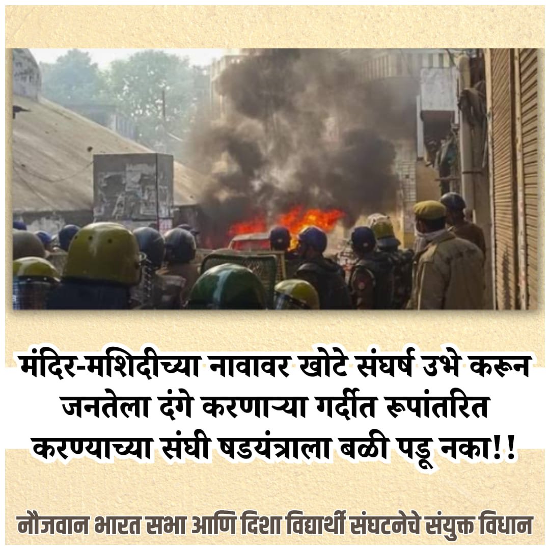 मंदिर-मशिदीच्या नावावर खोटे संघर्ष उभे करून जनतेला दंगे करणाऱ्या गर्दीत रूपांतरित करण्याच्या संघी षडयंत्राला बळी पडू नका!!