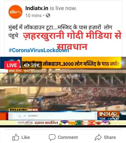 ऐसे में तथ्यतः प्रवासी मज़दूर अपने घर जाने के लिए बांद्रा स्टेशन इक्कठा हुए थे। मुम्बई के बांद्रा स्टेशन के 60 मीटर की दूरी पर ही मस्ज़िद पहले से है।ऐसे में यह बात कोड़ी बकवास है की मस्ज़िद के पास इक्कठा हुए, जो गोदी मीडिया बताने की कोशिश कर रहा है।यह भी समझना होगा कि बांद्रा, मुम्बई में भी दो दुनिया बसती है। बांद्रा ईस्ट और बांद्रा वेस्ट के रूप में , जहां एक तरफ गैटी गैलेक्सी सिनेमा हॉल, मॉल और अमीरज़ादों की बस्तियां है। वही दूसरी तरफ की तस्वीर आम मज़दूर-मेहनतकश वर्ग की बस्तियां है ।जो मेहनत के दम पर दो जून की रोटी खाते है। इस मुश्किल के हालात में वह अपने घर लौटने का सोच रही थी । पर जब यह अफवाह उड़ी की आज ट्रैन चल रही है, तो वह बांद्रा स्टेशन वापस अपने घर जाने के लिए पहुंची थी। ऐसे में इस पूरे मुद्दे को साम्प्रदयिक बनाने के तहत किया जा रहा है। इन सब के बीच भाजपा और शिवसेना में छींटाकसी का खेल भी जारी है। ऐसे में गोदी मीडिया के साम्प्रदायिक ज़हर फैलाने के काम का पूर्ण निषेध करना चाहिए और उनपर सख्त कार्यवाही की जानी चाहिए।
