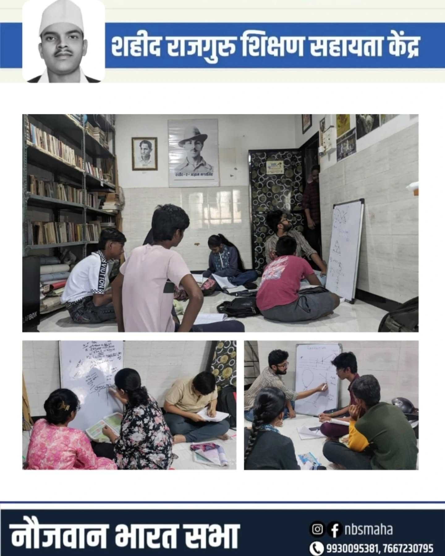 मित्र-मैत्रिणींनो, नौजवान भारत सभा, मुंबई द्वारे संचालित शहीद राजगुरू शिक्षण सहायता केंद्रामध्ये नववी ते बारावीच्या विद्यार्थ्यांसाठी नियमितपणे अभ्यास वर्ग सुरू आहेत. आगामी बोर्ड परीक्षेच्या तयारीसाठी दहावी आणि बारावीच्या विद्यार्थ्यांसाठी विशेष सत्र आयोजित करण्यात आले आहेत. यात हिंदी, इंग्रजी, गणित, विज्ञान, मराठी इत्यादी विषयांसाठी अतिरिक्त शिकवणी वर्गांचा समावेश आहे. यामध्ये शंका निरसन सत्र, सराव परीक्षा घेणे आणि इतर महत्त्वाचे विषय पुन्हा शिकवले जात आहेत. आम्ही मानतो की सर्वांना निःशुल्क, समान आणि दर्जेदार शिक्षण देणे ही सरकारची जबाबदारी आहे; परंतु सरकार शिक्षणक्षेत्रातील आपल्या जबाबदारी फेटाळून देत आहे. आजच्या नफेखोर भांडवली व्यवस्थेमध्ये शिक्षणाला एक बाजारू माल बनवले केले आहे. अशा परिस्थितीत आपण ‘निःशुल्क, समान आणि दर्जेदार शिक्षण’ मिळवण्यासाठी संघर्ष उभारण्याची गरज आहे, आणि त्यासोबतच आपण प्रत्येक व्यक्तीपर्यंत शिक्षण पोहोचवण्यासाठी प्रयत्न करणे आवश्यक आहे. समाजाकडून आपल्याला मिळालेले ज्ञान समाजापर्यंत परत नेणे हे आपले कर्तव्य आहे. म्हणून आम्ही सर्व न्यायप्रिय नागरिकांना आवाहन करतो की, त्यांनी प्रत्येक व्यक्तीपर्यंत निःशुल्क, समान आणि दर्जेदार शिक्षण पोहोचवण्याच्या संघर्षात आपली भूमिका सुनिश्चित करावी. नौजवान भारत सभेद्वारे संचालित शहीद राजगुरू शिक्षण सहायता केंद्रामध्ये शिकवण्यासाठी आपला वेळ द्यावा. संपर्क:7667230795
