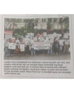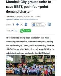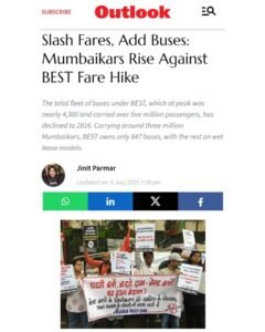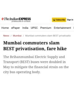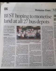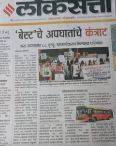 Press coverage of the protest organized by Naujawan Bharat Sabha, along with various student and youth organizations, civil society groups, individual commuters, and trade unions, at the Wadala BEST depot under the banner of ‘Aamchi Mumbai Aamchi BEST’, against the recent fare hikes and the ongoing privatization of BEST.