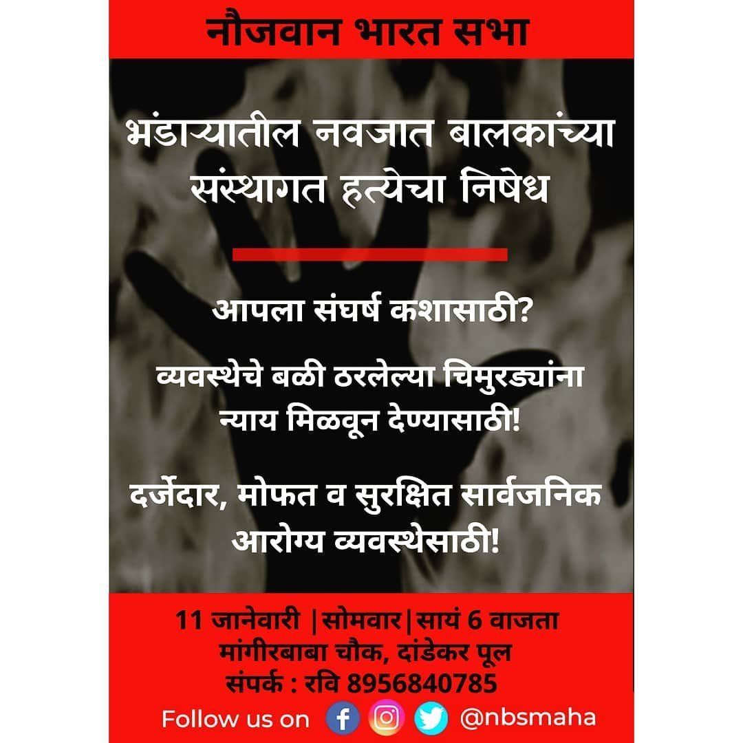 2015 मधेच भंडारा जिल्हा शासकीय रुग्णालयातील नवजात शिशु अतिदक्षता विभागाचे उद्घाटन झाले तेव्हा विभागामध्ये अग्निशमनाची व्यवस्था नव्हती. त्यानंतर आग लागल्यावर कराव्या लागणाऱ्या आपत्कालीन कृतींची तालीम फक्त एकदाच 2016 मध्ये करण्यात आली, जी वर्षातून दोन वेळा करायची असते. मागच्या दोन वर्षांपासून कर्मचाऱ्यांचे अग्निशमनासाठी घेण्यात येणारे प्रशिक्षण सुद्धा घेण्यात आले नव्हते, जे दरवर्षी व्हायला पाहिजे. मे 2020 मध्ये भंडारा जिल्हा प्रशासनाने राज्य सरकारला या रुग्णालयात अग्निशमन यंत्रणा बसवण्यासाठी प्रस्ताव पाठवला होता. परंतु आरोग्य विभागाकडून त्यावर काहीच कार्यवाही झाली नाही. त्याबद्दल विचारले असता आरोग्य मंत्री म्हणतात की त्यांना याबद्दल काहीच माहीत नाही. अशा परिस्थितीमध्ये योग्य प्रशिक्षण आणि सुविधांच्या अभावी उपस्थित कर्मचारी जे करू शकत होते ते केले गेले. 17 पैकी 7 नवजात शिशुंना वाचविण्यात यश आले. उर्वरित दहा शिशुंना मृत्यूने आपल्या तावडीत घेतले. सर्व मृतांची अपघाती मृत्यू अशी नोंद झाली आहे. हे अपघाती मृत्यू आहेत? बिलकुल नाही! हे अपघाती मृत्यू नसून खर्चकपात करणाऱ्या, निष्काळजीपणा करणाऱ्या राज्य आरोग्य विभाग व प्रशासनाकडून घडलेल्या संस्थात्मक हत्या आहेत. फॅसिस्ट भाजप असो वा धर्मनिरपेक्षतेचे आणि लोकशाहीचे ढोंग करणारे आघाडी सरकार असो, जनतेच्या आरोग्याला सर्वांनीच वाऱ्यावर सोडले आहे हे स्पष्ट आहे.