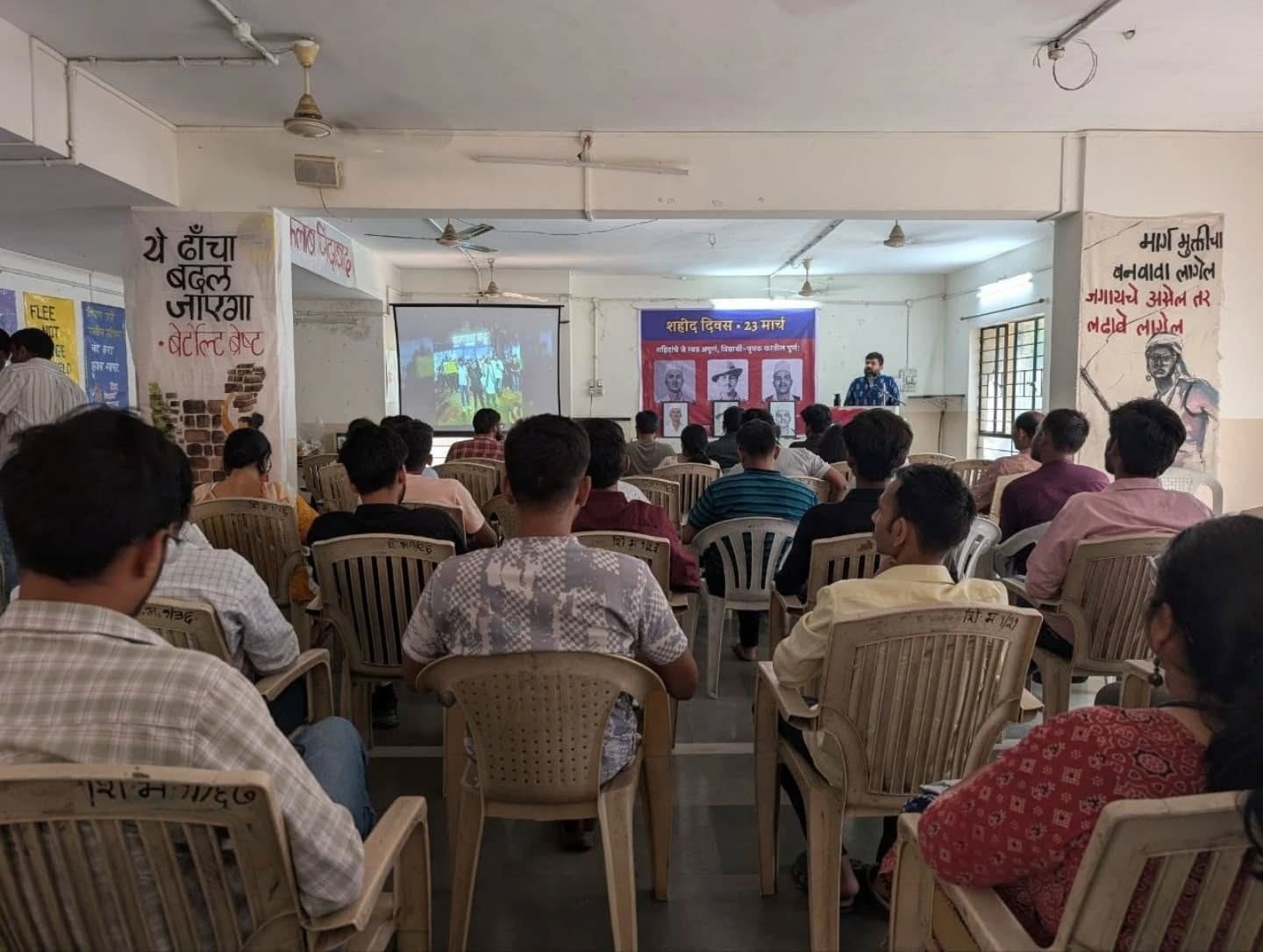 शहीद भगतसिंह, राजगुरू आणि सुखदेव यांचे स्वप्न अपुरे! कष्टकरी आणि नवयुवक करतील पुरे!! साथींनो, आज आपण एका अशा काळात जगत आहोत जेव्हा फासीवादी शक्तींचा हल्ला निरंतर वाढत चालला आहे. तर दुसऱ्या बाजूला सामान्य जनता नरकासमान परिस्थितीमध्ये जगण्यासाठी मजबूर आहे. लोकांनी संघटीत होऊ नये यासाठी कट्टरपंथ, सांप्रदायिकता आणि अंधराष्ट्रवादाचे जहर लोकांच्या डोक्यात भरले जात आहे. तर्क, प्रगतिशील विचार व मानवतेला पुढे घेऊन जाणाऱ्या मूल्यांवर संघटीत हल्ले सुरु आहेत. अशा काळात भगतसिंह यांच्या शब्दात “क्रांतीचे चैतन्य जागे करण्यासाठी जेणेकरून मानवतेच्या आत्म्यात खळबळ पैदा होईल” आम्ही शहीद भगतसिंह, राजगुरू आणि सुखदेव यांच्या 92…
