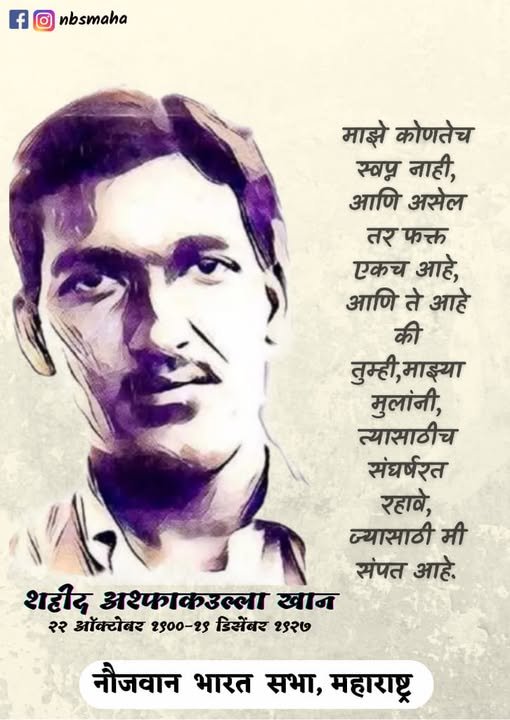 माझे कोणतेच स्वप्न नाही, आणि असेल तर फक्त एकच आहे, आणि ते आहे की तुम्ही,माझ्या मुलांनी, त्यासाठीच संघर्षरत रहावे, ज्यासाठी मी संपत आहे. भारतीय स्वातंत्र्य लढ्यातील आणि काकोरी कांड प्रकरणामध्ये महत्वाची भूमिका निभावलेल्या अशफाकउल्ला खान यांना क्रांतिकारी सलाम! जन्म: २२ ऑक्टोबर १९०० मृत्यू: १९ डिसेंबर १९२७