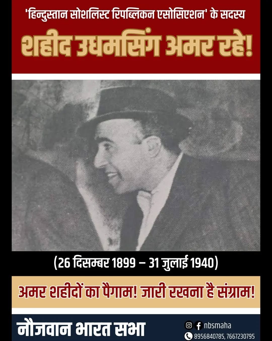 शहीद उधमसिंह अमर रहे! अमर शहीदों का पैगाम! जारी रखना है संग्राम! जन्म: 26 डिसेंबर 1899 (सुनाम, जिल्हा संगरूर, पंजाब, भारत) शहीद: 31 जुलै 1940 (पेंटोविले जेल, लंडन, यूकेमध्ये फाशी) अमर शहीद उधम सिंह यांचा आज शहीद दिवस. उधम सिंह हे भारताच्या स्वातंत्र्य चळवळीतील एक अमर सेनानी आहेत. अमृतसरचे जालियनवाला बाग हत्याकांड कोण विसरू शकेल! येथे 13 एप्रिल 1919 रोजी बैसाखीच्या दिवशी इंग्रजांनी नि:शस्त्र लोकांवर गोळीबार केला होता. या गोळीबारात हजारो लोक जखमी आणि शहीद झाले. गोळीबार करण्याचे आदेश ‘जनरल एडवर्ड हॅरी डायर’ नावाच्या इंग्रज अधिकाऱ्याने दिले होते पण त्यामागे…